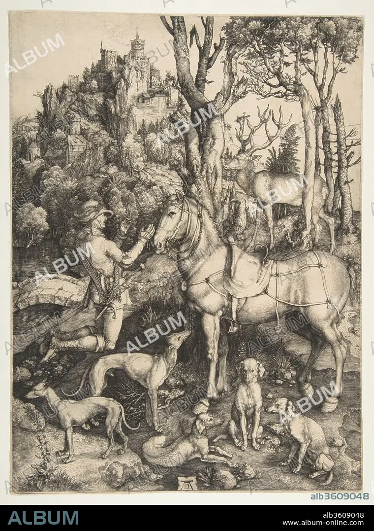 Dürer's largest engraving depicts the moment of conversion of a Roman general named Placidus. While hunting, Placidus saw a crucifix miraculously appearing between a stag's antlers. The stag spoke in Christ's voice, and Placidus fell from his horse and became a Christian baptized with the name Eustace. The print has long been admired as an exemplar of Dürer's extraordinary virtuosity; the animals and features of the landscape served as models for artists for the following century.