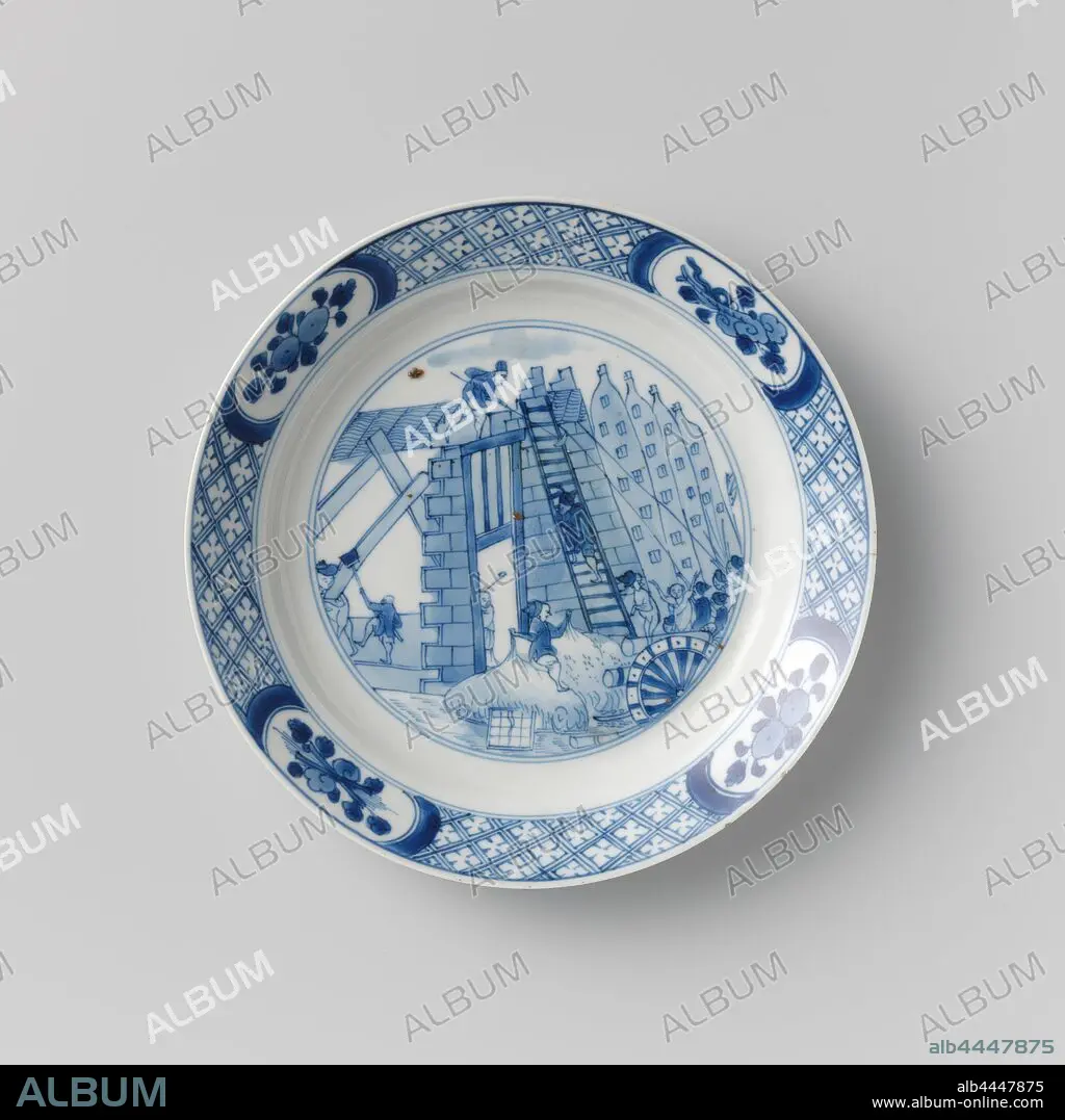 Caption: Plate with the Costerman revolt, the looting of the house by Jacob van Zuylen, Porcelain plate, painted in underglaze blue. On the shelf a depiction of the Costerman riot with the looting and demolition of the house of the chief scout Jacob van Zuylen van Nyevelt, the left in the row, guns in the foreground, behind it a group of men who try to pull over the facade with the help of ropes, furthermore a man on a ladder, a man carrying woodwork from the house, and a man with a broom. The border with napkin work with four cartouches saved in it with mushrooms (lingzhi) or fruit branches. The back with a band with lotus tendrils and swastika motif. Marked on the underside with the six-character mark of Emperor Chenghua in a double circle. A crack in the edge. European representation in blue and white., Rotterdam, Jacob van Zuylen van Nyevelt, anonymous, China, c. 1690 - c. 1700, Qing-dynasty (1644-1912) / Kangxi-period (1662-1722), porcelain (material), glaze, cobalt (mineral), vitrification, h 2.8 cm d 20.1 cm d 12 cm