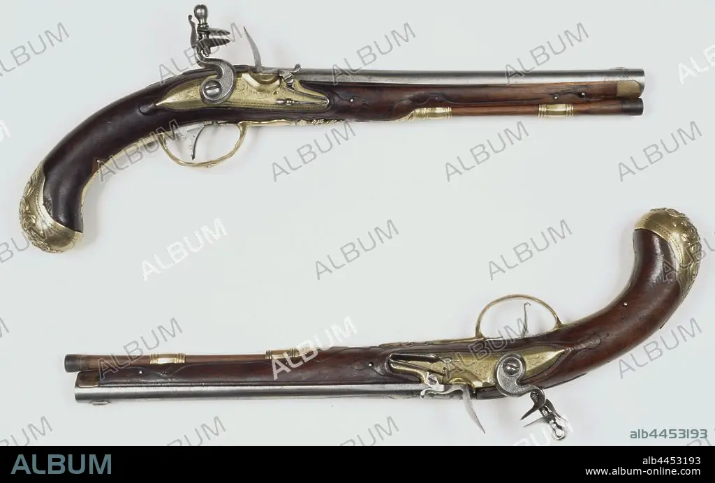 Caption: Flint gun, Flint gun with a round, round, embossed iron barrel, the rear part of which is engraved with an ornamental pattern, with a silver visor grain at the end. The drawer is made of wood and has notched patterns on the underside. The lock case is made of bronze in which leaf and flower motifs are engraved, on the underside of the lock case the name 'IL. BEHR. Iron rooster whose rim is decorated, the end of the steel spring is a round head with a point on it. The flask is entirely made of wood, the head of the flask is made of bronze in which the head of a monster is engraved. The other side of the lock plate is covered with bronze in the form of floral motifs. Under the drawer is a wooden loading stick in a copper tube, Netherlands, J.J. Behr, Liège (city), c. 1720 - c. 1740, lade, vizierkorrel, slotplaat, kolfkap, kolf, laadstok, loop, haan, vuurstaal, engraving, l 39 cm l 24.5 cm d 13.8 mm