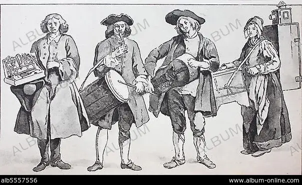Mode, Kleidung in Frankreich, Rokoko, Pariser Straßenleben um 1740, von links, ein Messer- und ein Scherenhändler, ein Straßenmusikant mit Trommel und Flöte, ein Straßenmusikant mit einem historischen Instrument, dem Bauernleier, und ein Mädchen mit einer Laterna magica und einer Leierkasten, digital restaurierte Reproduktion einer Originalvorlage aus dem 19. Jahrhundert, genaues Originaldatum nicht bekannt