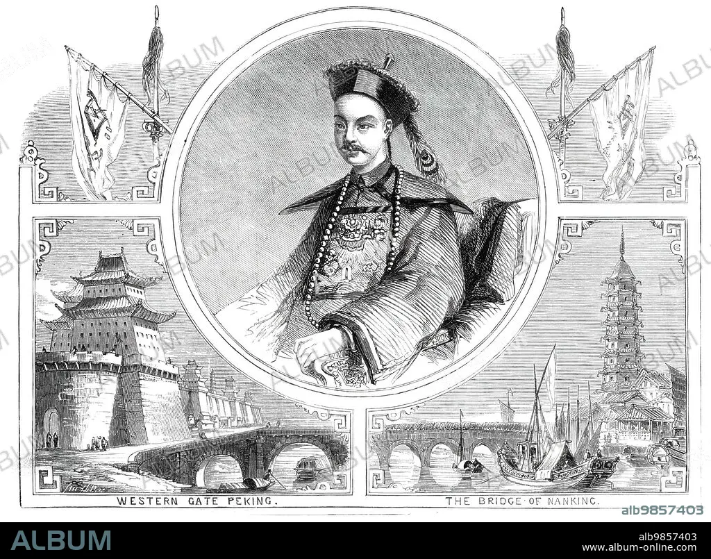 Caption: Hien-Fou, the Emperor of China, 1860. Portrait of Xianfeng Emperor, with views of '...Western Gate Peking; The Bridge of Nanking...His appearance is altogether commanding, and he devotes considerable attention to gymnastic exercises...His complexion is, perhaps, darker than that of his countrymen in general; and his noble forehead, thick arched eyebrows, and piercing eyes, give him an appearance of great distinction, which is by no means diminished by the unusual thinness of his lips, although the square and high cheekbone at once mark the descendant of the pure Tartar race...Completely violating the conservatism of the Chinese notions, of female beauty (always supposed to consist in feet small to deformity and long, slender waists), Hien-Fou formed a matrimonial alliance with the daughter of a Mongol chief - a lady remarkable alike for her physical accomplishments and the unchecked development of the means of locomotion. The Court soon became composed of women of the same race, who have entirely superseded those poor crippled beauties who formerly held sway there, and now have to retire with jealousy before a band of robust Amazons, whose amusements of riding, hunting, shooting, and even footraces, are shared by the Emperor himself'. From "Illustrated London News", 1860.