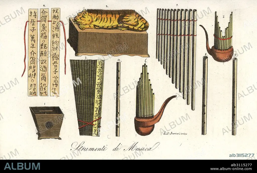Caption: Chinese musical instruments: zhu 1, yu in the shape of a tiger 2, paiban 3, free-reed bamboo sheng 5,6, bamboo pipes 7, flutes or dizi 8,9,10. Handcoloured copperplate engraving by Andrea Bernieri from Giulio Ferrrario's Costumes Antique and Modern of All Peoples (Il Costume Antico e Moderno di Tutti i Popoli), Florence, 1842.
