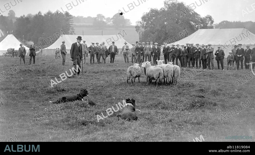 Caption: International Sheepdog Trials at Talybont. mr Ernest Priestly, of Hathersge Derbyshire, working his famous dogs "Moss" and "Lu". 1924