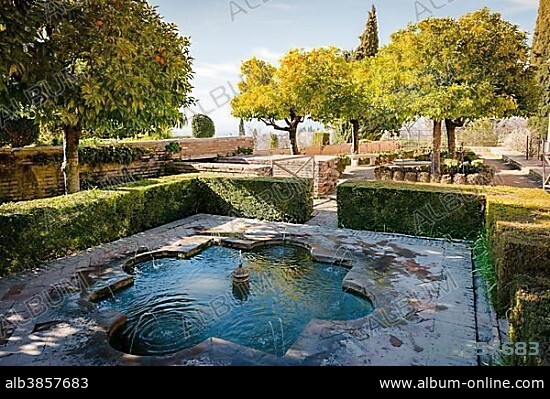 Garden with fountain, Summer Palace Generalife, Palacio de Generalife, Granada, Andalusia, Spain, Europe