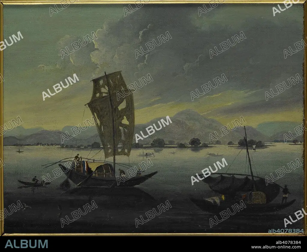 SIR CHARLES D'OYLY. Boats on the River Ganges with the Rajmahal Hills beyond. c. 1825. Oil painting. Source: Foster 866.
