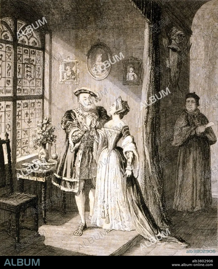 Caption: Etching entitled: Henry's reconciliation with Anne Boleyn. Anne Boleyn (1501 - May 19, 1536) was Queen of England from 1533 to 1536 as the second wife of Henry VIII. In 1526 Anne resisted Henry VIII's attempts to seduce her and refused to become his mistress as her sister Mary had. When it became clear that Pope Clement VII would not annul the marriage, the breaking of the power of the Catholic Church in England began. In 1533 she gave birth to the future Elizabeth I of England, whose sex disappointed Henry. Three miscarriages followed and by March 1536, Henry was courting Jane Seymour. Henry had Anne investigated for high treason. The charges against her, which included adultery and incest. She was beheaded on May 19th, 1536. Henry's marriage to Anne, and her subsequent execution, made her a key figure in the political and religious upheaval that was the start of the English Reformation.