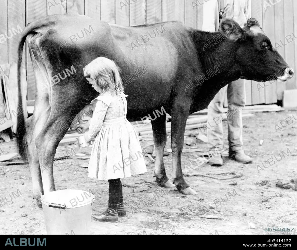 Little girl milks cow as old man stands by. A milkmaid (or milk maid) was a girl or woman who milked cows. She also used the milk to prepare dairy products such as cream, butter, and cheese. Many large houses employed milkmaids instead of having other staff do the work. As an agricultural product, milk is extracted from farm animals during or soon after pregnancy.Throughout the world, more than six billion people consume milk and milk products. Over 750 million people live in dairy farming households. Milk is a nutrient-rich, white liquid food produced by the mammary glands of mammals. It is the primary source of nutrition for infant mammals (including humans who are breastfed) before they are able to digest other types of food. No photographer credited, 1902.