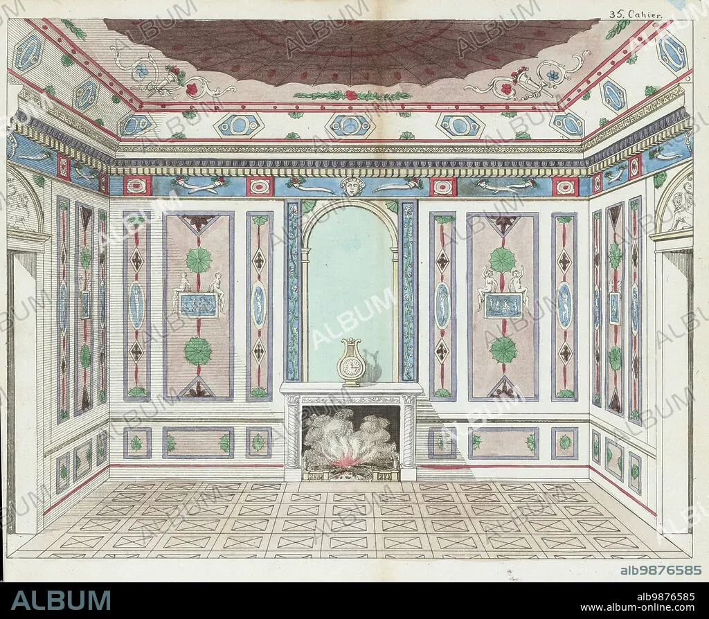 Revolutionary era interior design for a salon. Ceiling with rosette in the form of a parasol, white marble chimney, walls decorated with cameos, garlands, frieze and filets. Handcoloured copperplate engraving from Jean-Antoine le Brun or Lebrun-Tossas Journal de la Mode et du Gout, previously Cabinet des Modes, Chez Buisson, Paris, and Joseph le Boffe, London, 35me Cahier, 5 February 1791.