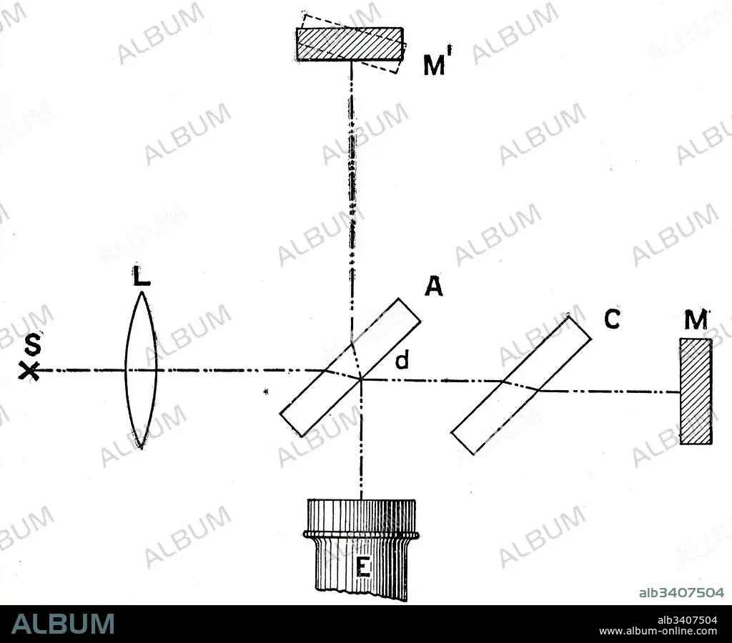 Caption: Diagram depicting a Michelson interferometer, used for measuring the velocity of light. Invented by Albert A. Michelson (1852-1931) an American physicist and noble prize in physics winner. Dated 20th Century.