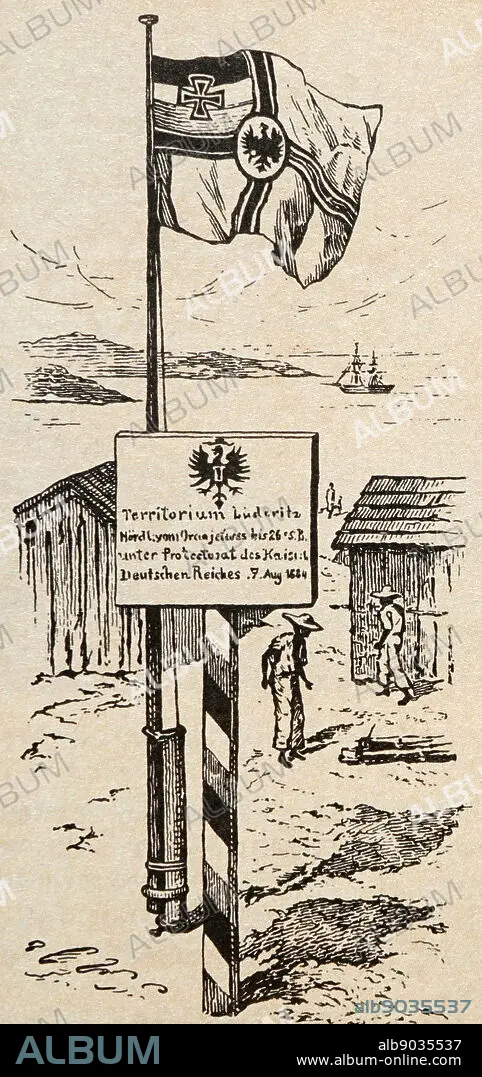 Caption: The first territory captured in South-West Africa in 1883-1884 by the commissioners of the Bremen merchant Luderitz. The inscription under the emblem of Germany indicates that the territory is under the auspices of German troops.