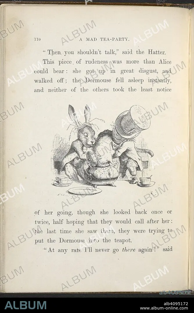 The Mad Hatter and March hare trying to put the Dormouse into a teapot. Alice's Adventures in Wonderland. With forty-two illustrations by John Tenniel. London : Macmillan & Co., 1866 [1865]. Source: C.59.g.11 page 110.