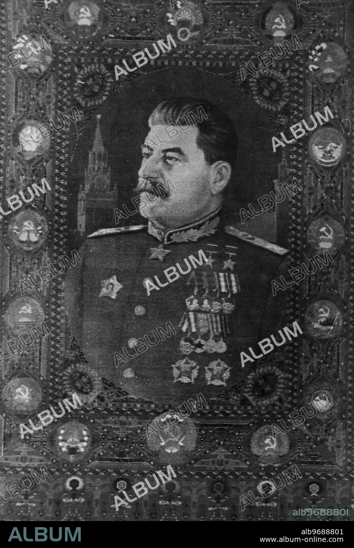 Caption: Great perfection is reached by folk artists who have preserved the age-old traditions of the popular art. Folk artists make frequent use of the figure of Joseph Stalin in their work. This is a carpet with a woven portrait of Stalin made by Armenian carpet weavers from a drawing by D.Karanfelyan a connoisseur of Armenian folk art. Undated. Supplied by: SCRSS - Society for Co-operation in Russian & Soviet Studies.