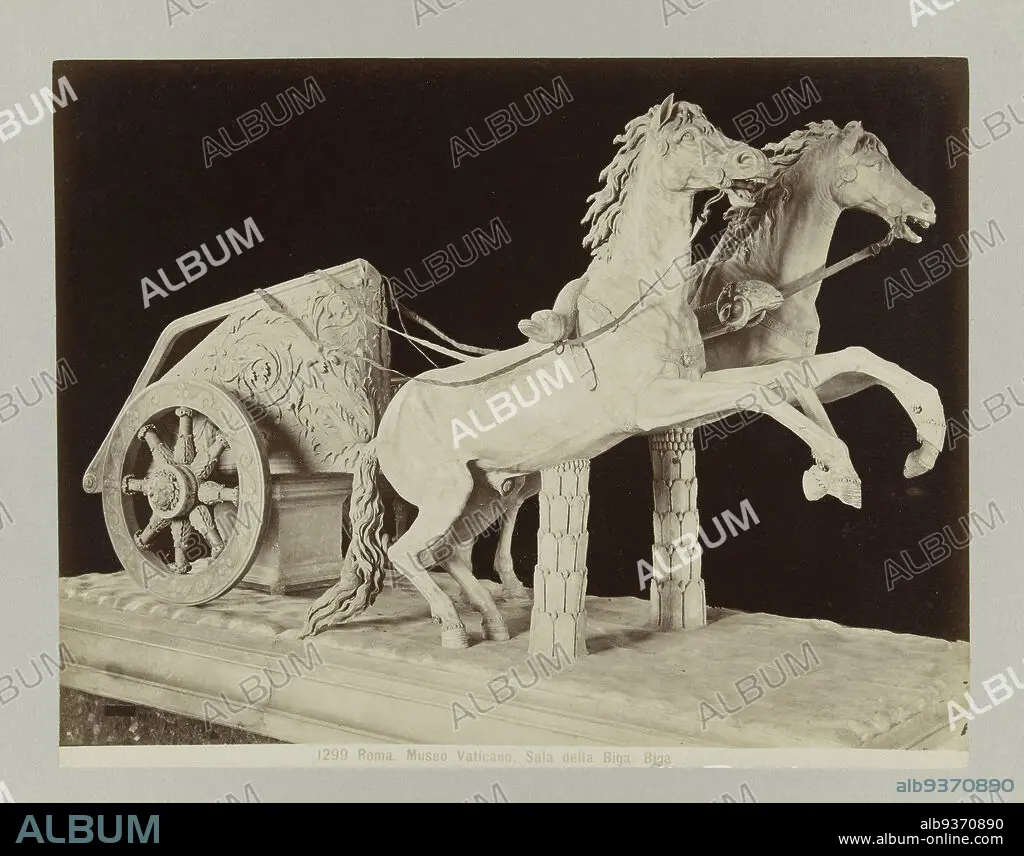 Caption: Sculpture of chariot drawn by two horses1299 Roma. Museo Vaticano. Sala della Biga. Biga (title on object), A rectangular box is drawn in black ink on the lower left, possibly over a written number., anonymous, Rome, c. 1880 - c. 1904, paper, albumen print, height 198 mm × width 253 mmheight 241 mm × width 327 mm