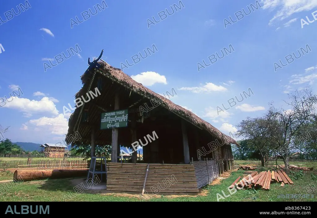 Title: Burma / Myanmar: Jinghpaw (Kachin) ceremonial house at the manau< / i> grounds (a manau< / i> is a traditional dance ceremony), Waingmaw, Kachin State (1998)