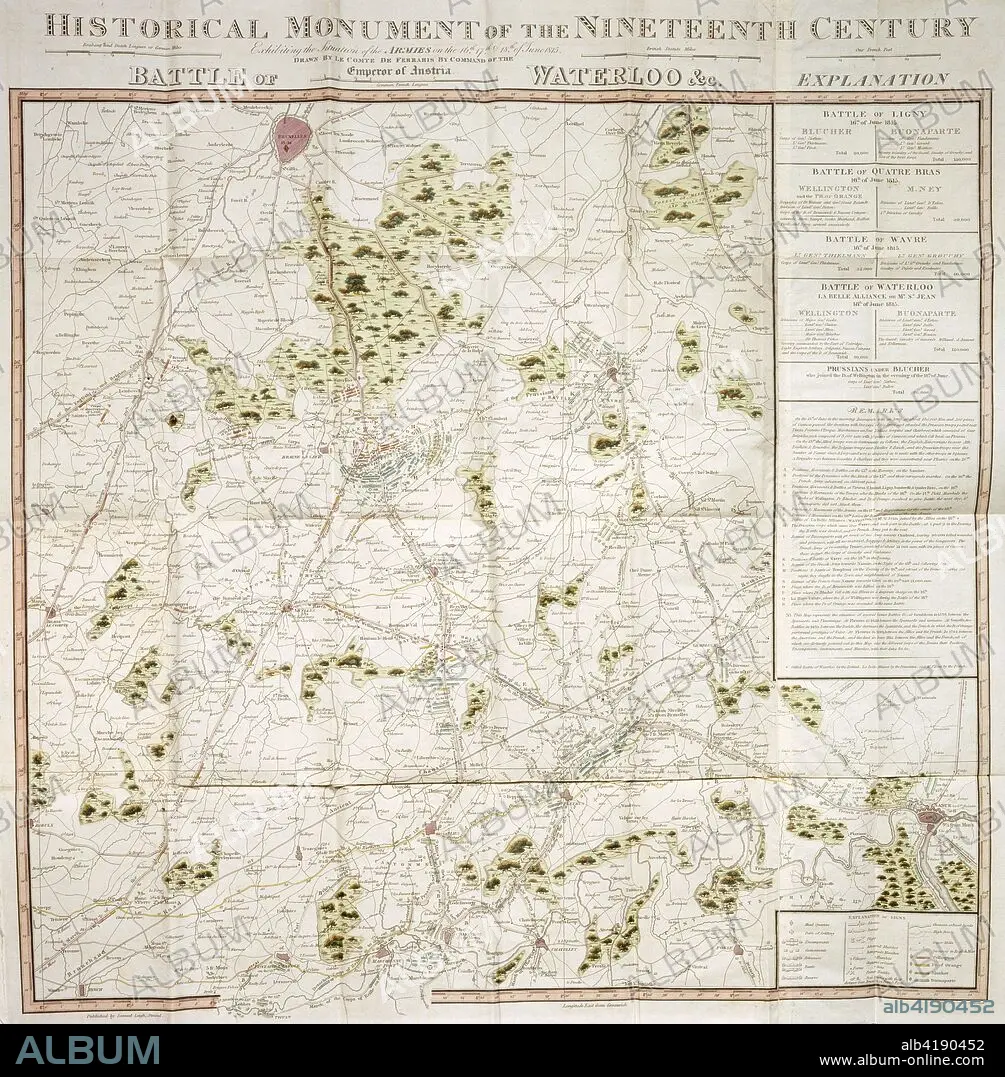 Caption: Map of the Waterloo campaign, 1815, Walmer Castle, Kent. Map Exhibiting the Situation of the Armies on the 16, 17 & 18 of June 1815. The Battle of Ligny, Quatre Bras, Waterloo and Wavre.