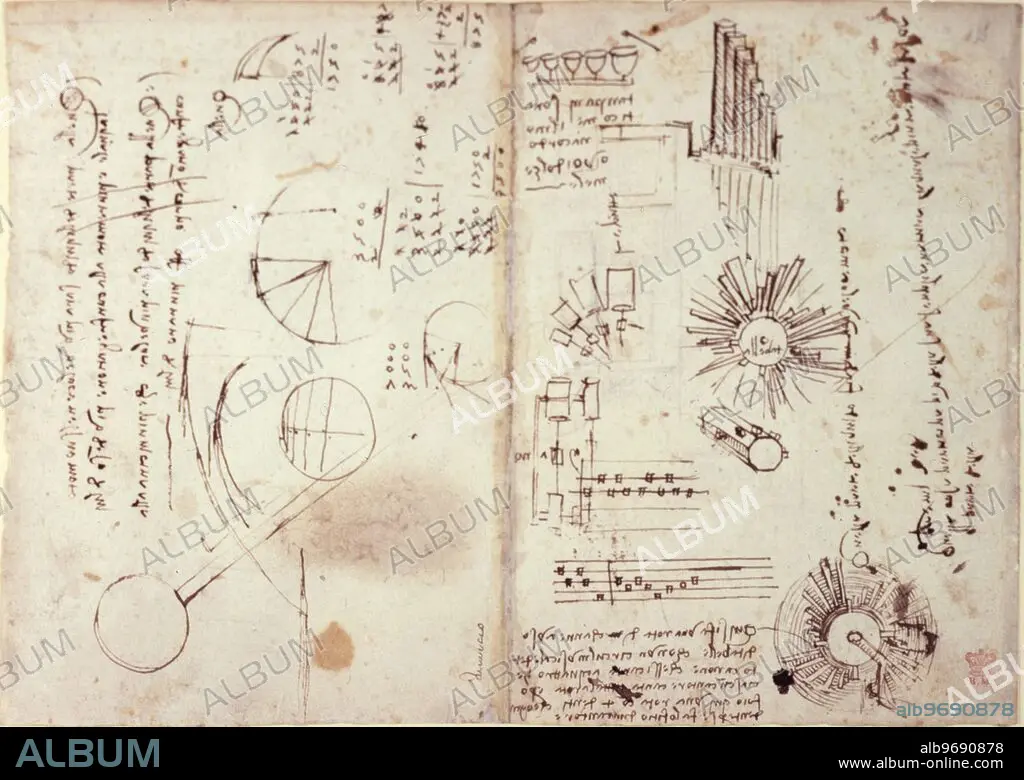 Caption: Notes and drawings by Leonardo da Vinci, early 16th century. Pages from the Notebook of Leonardo da Vinci (1452-1519), showing sketches and diagrams.