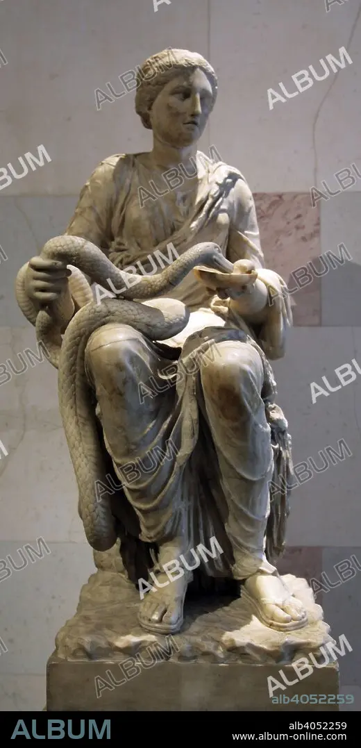 Caption: Statue of Hygieia, Goddess of Health. Roman, after a Greek original of 3rd century BC. In Greek and Roman mythology Hygieia was the daughter of Asklepios, the God of Medicine. Her name is the source of the word 'hygiene'. Found in the collection of The Hermitage, St Petersburg.
