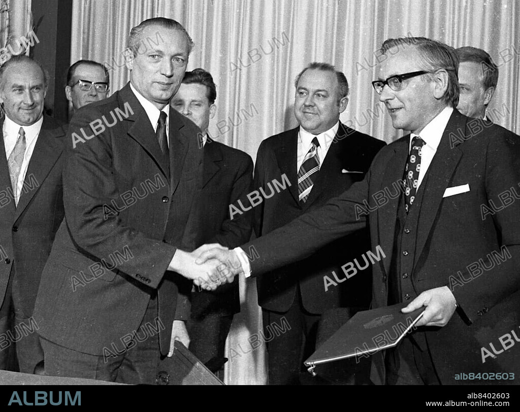 The Secretary of State Guenter Gaus and the Deputy Foreign Minister of the GDR Kurt Nier signed the protocol on the establishment of permanent representations in Bonn on 14 March 1974. Kurt Nier left Guenter Gaus, Germany, Europe.