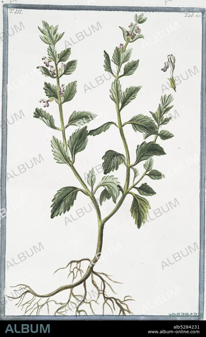 Caption: Chamædrys major, repens = Chamædrys, vulgo, vera existimata = Quercignola, e Camedrio = Germandrée. Germander, still image, 1772 - 1793, Bonelli, Giorgio (b. 1724), Martelli, Niccoló (1735-1829)