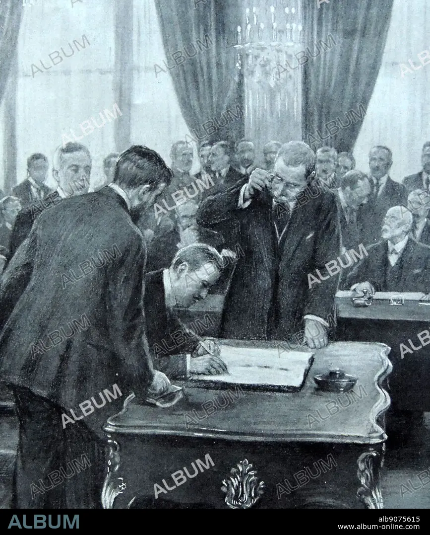 Caption: closing session of the Versailles peace conference 1920. Whilst these important events were taking place in the internal politics of France, the final stages in the ratifying of the peace treaty with Germany were being passed through. The Treaty of Versailles was to come into force so soon as it had been ratified by Germany and by three of the principal Allied and Associated Powers; and since it had now been ratified by Germany and by France, the United Kingdom, Italy, and Japan (though not by the United States), it was only necessary that the protocols certifying these facts should be signed by the parties to the treaty. The Supreme Council of the Allies decided that this final ceremony should take place in Paris on 10 January. Two delegates were sent by the German government to carry out the signing of the protocol, Baron Kurt von Lersner and Herr von Simson. The ceremony took place at the Ministry of Foreign Affairs in the Quai d'Orsay shortly after four o'clock on the afternoon of 10 January.