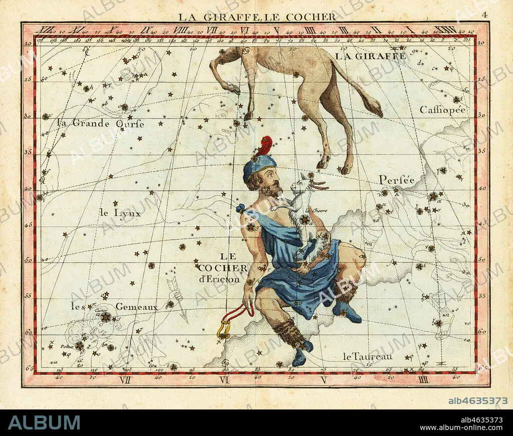 Caption: Camelopardalis and Auriga. With Cassiopeia, Lynx, Taurus, Ursa Major, Perseus, Gemini. Le girafe et le cocher. Handcoloured copperplate engraving from John Flamsteed and Nicolas Fortins Celestial Atlas or Atlas Celeste de Flamsteed, Lalande, Paris, 1795.