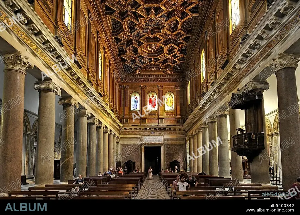 Nave with antique Ionic columns and coffered ceiling by Domenichino, Basilica Santa Maria in Trastevere, Rome, Lazio, Italy, Europe.