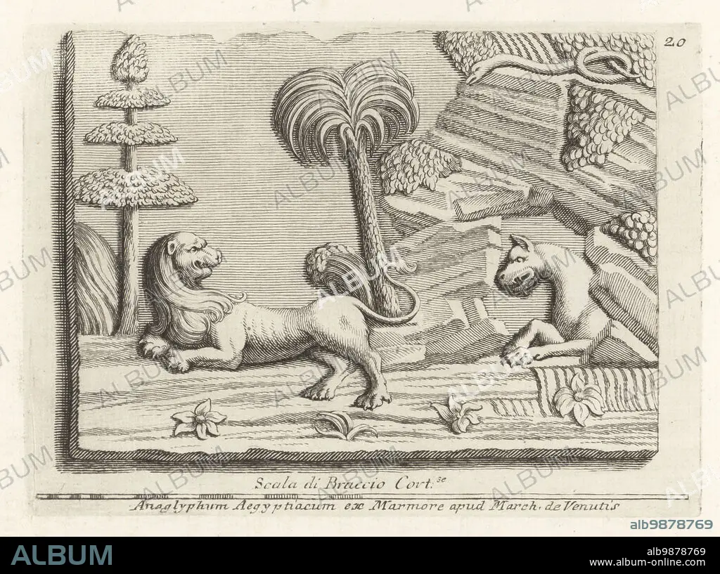A panther emerging from a Libyan cave to attack a lion. Egyptian bas relief in marble. Anaglyphum Aegyptiacum ex Marmore apud March. de Venutis. Scala di Braccio Cortonse. Copperplate engraving from Francesco Valesio, Antonio Gori and Ridolfino Venutis Academia Etrusca, Museum Cortonense in quo Vetera Monumenta, (Etruscan Academy or Museum of Cortona), Faustus Amideus, Rome, 1750.