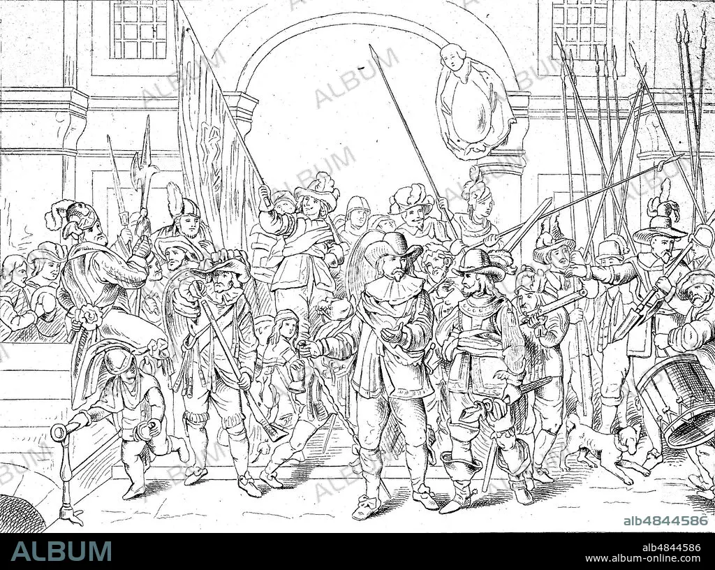 Caption: Militia Company of District II under the Command of Captain Frans Banninck Cocq, also known as The Shooting Company of Frans Banning Cocq and Willem van Ruytenburch, but commonly referred to as The Night Watch, is a 1642 painting by Rembrandt van Rijn, digital improved reproduction of an original print from the year 1881
