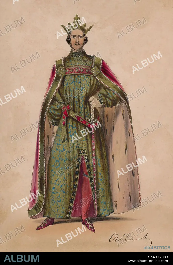 Caption: Prince Albert in costume as Plantagenet King Edward III for the Bal Costumé, May 12 1842, (1843). Albert (1819-1861) is dressed as Edward III (1312-1377) but is wearing the anachronistic jewelled Sword of Offering, made by Rundells for George IV's coronation in 1821. The costumes were designed under the supervision of James Robinson Planché and were specifically intended to give work to the declining Spitalfields silk industry. The royal couple's costumes were based on tomb effigies. The ball of 1842, held at Buckingham Palace in London, was the first of three costume balls held by Queen Victoria and Albert, Prince Consort. The second, on 6 June 1845, was in early Georgian dress, while the third, on 13 June 1851, was in the style of the Restoration. From "Souvenir of the Bal Costumé, given by H.M. Queen Victoria at Buckingham Palace, May 12, 1842 / drawings from the original dresses by Coke Smyth; letterpress by J.R. Planche", 1843. [Paul & Dominic Colnaghi & Co, London, 1843]