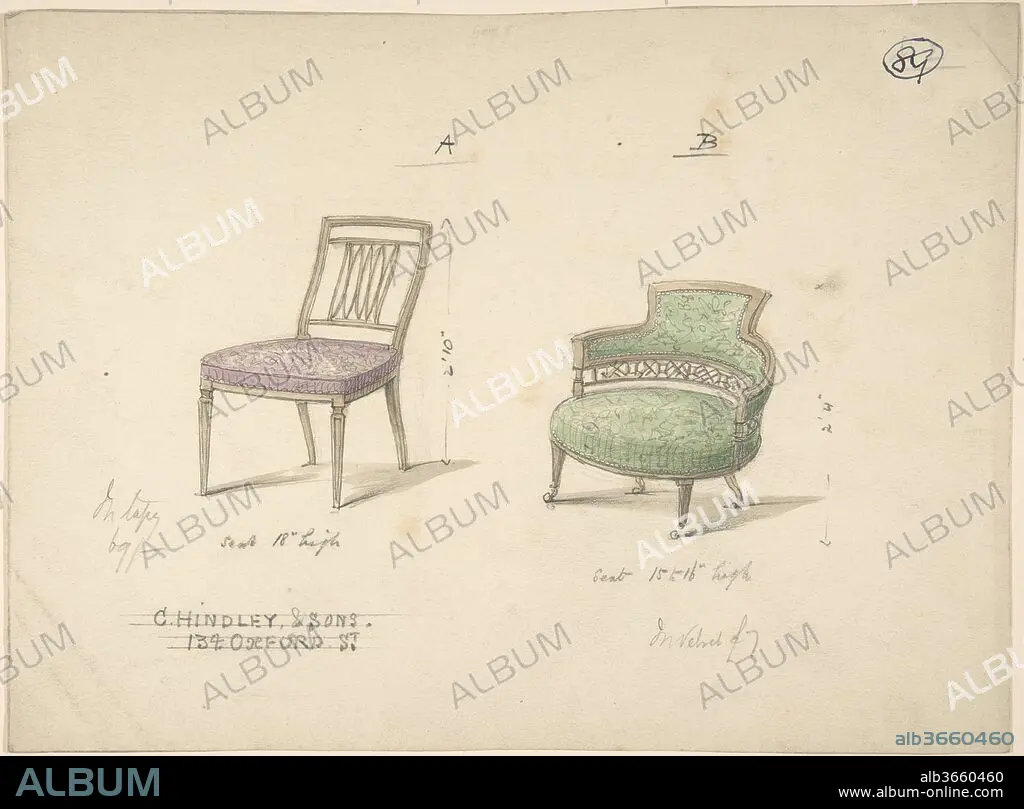Caption: Designs for Two Chairs. Artist: Charles Hindley and Sons (British, London 1841-1917 London). Dimensions: sheet: 7 15/16 x 10 11/16 in. (20.1 x 27.1 cm). Date: 1841-84.