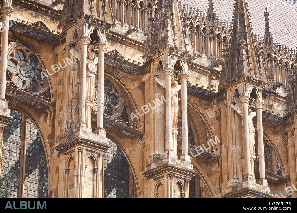 Caption: Detail of the gothic architecture on the southern facade of Notre Dame de Reims cathedrall, UNESCO World Heritage Site, Reims, Champagne-Ardenne, France, Europe