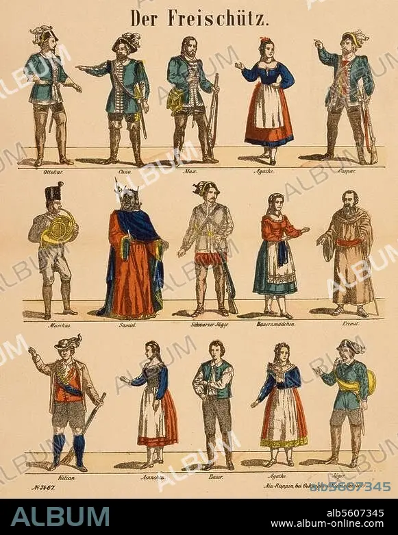 Caption: Weber, Carl Maria von; German composer. 1786-1826. Work: Der Freischütz (Opera; Libr.: F. Kind; première 1821). Figures from "Der Freischütz". Lithograph, coloured, c. 1840. Neuruppiner Bilderbogen. Private Collection.