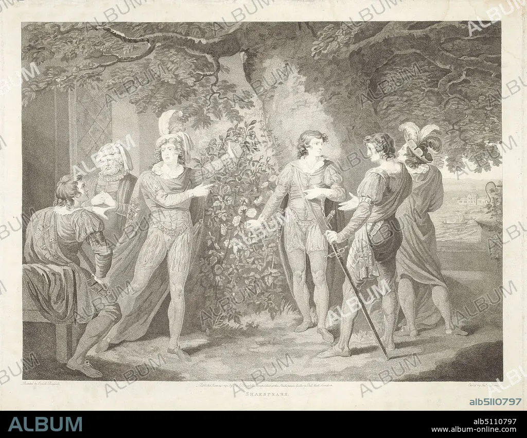 Caption: Henry VI, Part I: Act II, Scene IV, London. The Temple Garden., John Ogborne the Elder, 17551795, British, after Josiah Boydell, 17521817, British, 1803, Engraving, Sheet: 17 1/4 x 23 1/4in. (43.8 x 59.1cm)