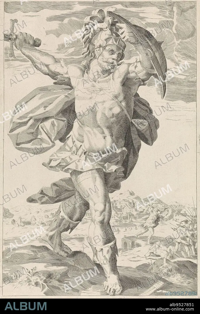 Caption: Horatius Cocles, Frederik Nicolaas Horatius Witsen Geysbeek, after Hendrick Goltzius, 1829, The full-length hero Horatius Cocles, a sword raised in the right hand, a shield in the left. In the background, he can be seen taking on an entire army on the banks of the Tiber., print maker: Frederik Nicolaas Horatius Witsen Geysbeek, (signed by artist), Hendrick Goltzius, Amsterdam, May-1829, paper, engraving, w 390 mm × h 260 mm