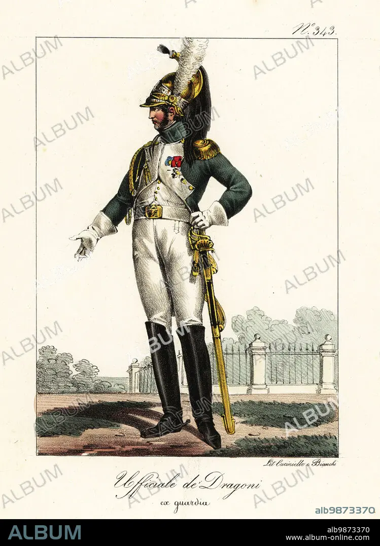 Caption: Uniform of an officer of the Dragoons, Napoleonic era. In plumed helmet, green coat with white lapels, gold epaulettes, white breeches, boots, sword. Officier de Dragons, ex-garde. Handcoloured lithograph by Lorenzo Bianchi and Domenico Cuciniello after Hippolyte Lecomte from Costumi civili e militari della monarchia francese dal 1200 al 1820, Naples, 1825. Italian edition of Lecomtes Civilian and military costumes of the French monarchy from 1200 to 1820.