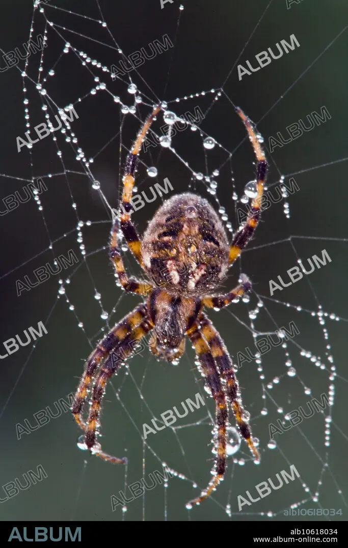 Caption: Dew on Black-and-yellow argiope (Argiope aurantia) spider. Omaha, Nebraska, USA.