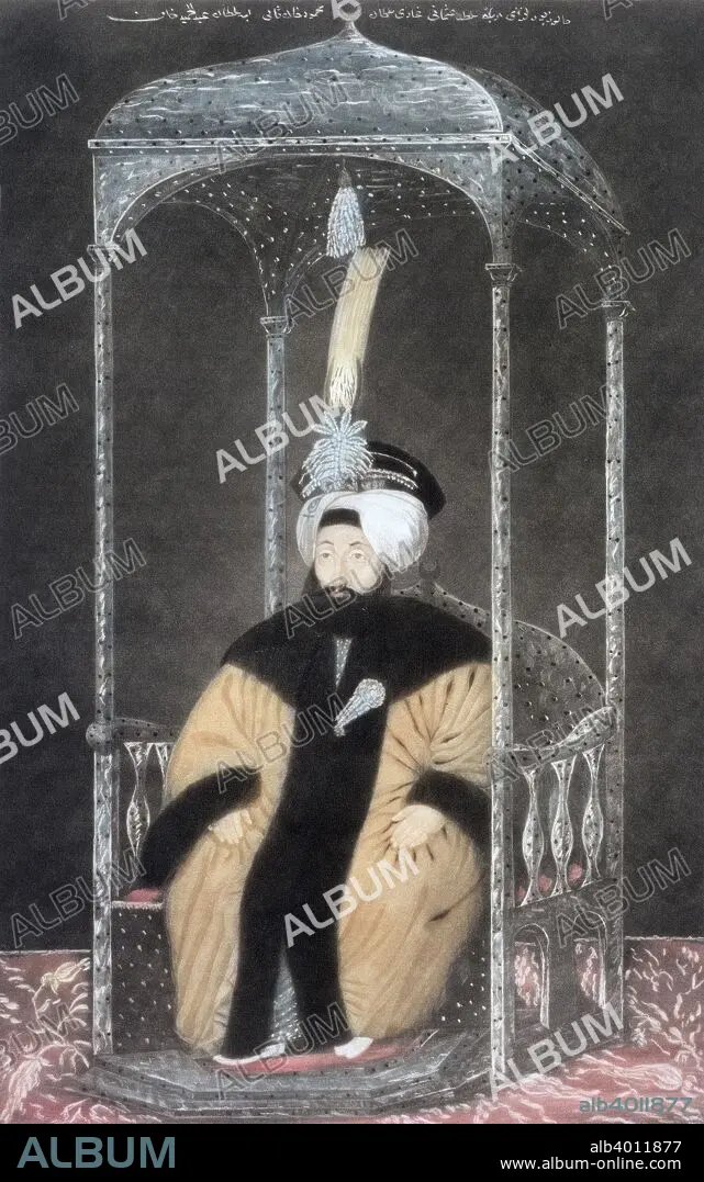 Caption: Mahmud II, Ottoman Emperor, 1808. Mahmud (1785-1839) became Sultan in 1808 after the overthrow of Mustafa IV. His reign saw a resumption of the programme of westernising reform begun by his cousin Selim III but interrupted when a conservative coup led to him being replaced by Mustafa. From A series of Portraits of the Emperors of Turkey, 1808.