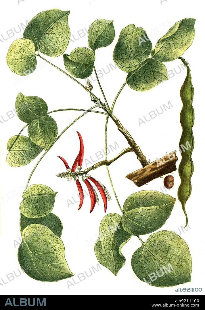 Caption: Botany, Plant, Coral arbor coral tree (Erythrina) flabelliformis, common name chilicote or western coral bean, Coral thorn, Historical, digitally restored reproduction from an 18th century original