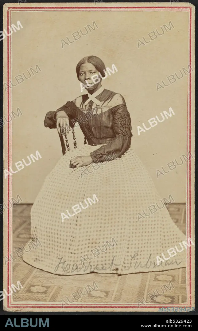 Caption: African-American anti-slavery activist Harriet Tubman (c1820-1913) was born into slavery in Maryland. She escaped in 1849, became a leading Abolitionist and was active as a 'conductor' in the Underground Railroad, the network which helped escaped slaves to reach safety. She is positioned slightly turned to the right and gazes off camera. Her right hand rests on the back of a wooden chair and her left hand rests in her lap. A patterned carpet covers the floor and the wall or drop behind her is a blank light color. Tubman wears a black bodice that buttons at the center front and has dropped sleeves with heavy ruching and ruffled details on the sleeves. There is a panel of lighter fabric around the yoke, with the upper neck the same dark color as the body of the bodice. A white lace collar with short tails is crossed and pinned at the front of her neck. Her hair is parted at the center and gathered at the nape of her neck. Tubman's full skirt is made from a light and dark patterned gingham check. It drapes slightly on the floor and hides her feet completely. The text "Harriet Tubman" is handwritten in graphite across the bottom of her skirt. The print is mounted on card stock and a double-lined red border is printed around the front edges of the card framing the print.