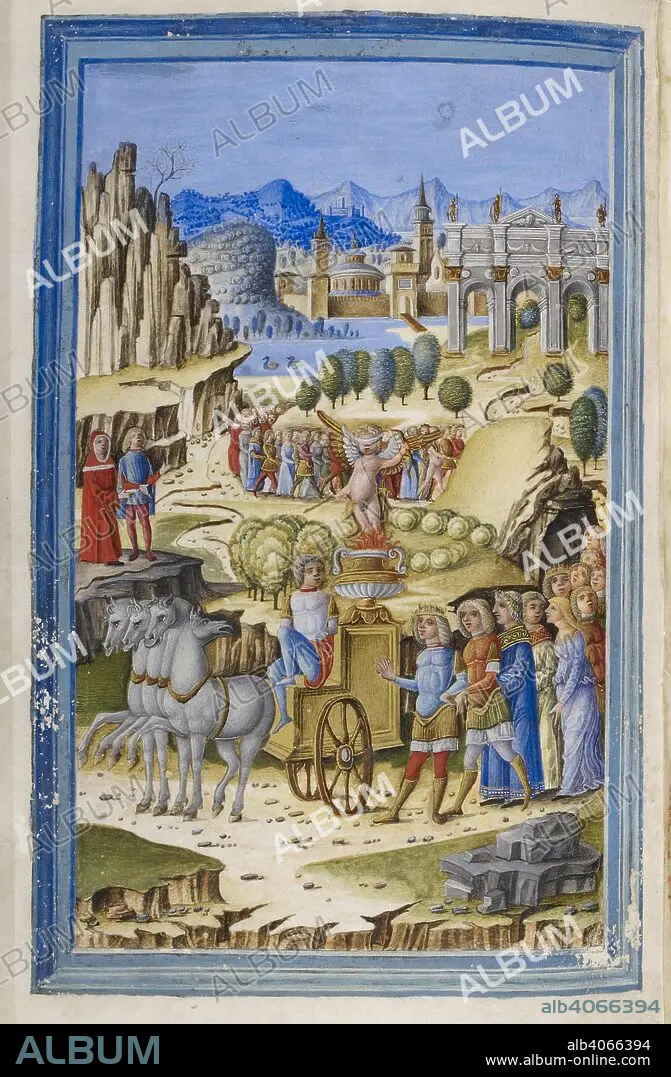 [Whole folio] The Triumph of Love. A blindfolded boy in his chariot leads a procession of all those he has enslaved. One of Love's victims detaches himself from the procession and explains to Petrach all that they see before them. Produced for a member of the Romei family of Ferrara. Poems of Petrarch. N. Italy; late 15th century. Source: Add. 38125, f.33v. Language: Italian.
