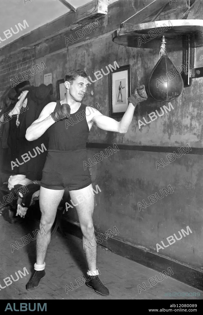 Caption: BOXING PEER IN TRAINING FOR FIGHT WITH POLICE-CONSTABLE. : Lord Knebworth, the 23 year old heir of the Earl of Lytton, who has already distinguished himself as a boxer of the welter-weight class, is in strict training for his four-round contest with Police Constable Bone of the Metropolitan Police at Ilford on April 2. He is training under Mr Alan Lambert with Alf Mancini, the professional boxer, as his sparring partner. Photo Shows: Lord Knebworth in fighting attitude at his training quarters. United Kingdom 1928