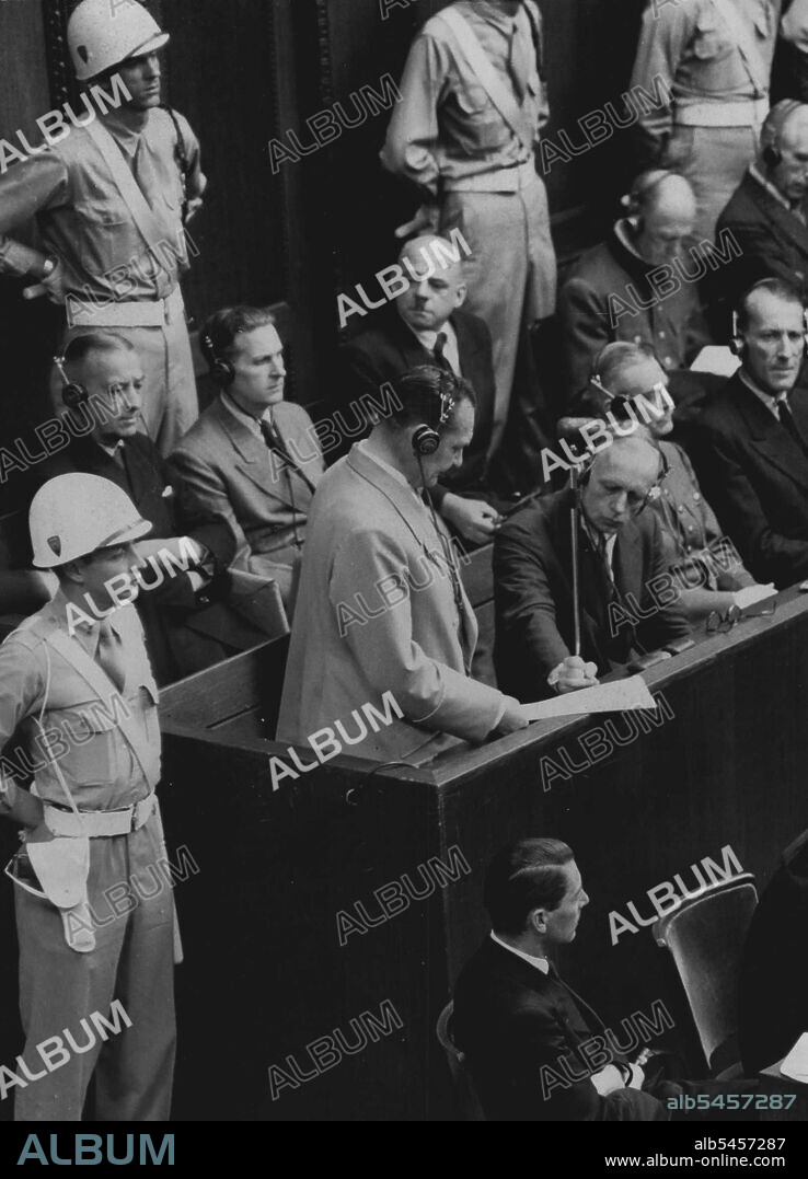 Goering - Iam innocent, first pictures, from Nuremberg -- Herman Goering is seen making his final plea at the Nuremberg court today August 31.Hermann Goering one-time Reichsmarshal and Luftwaffe chief, Led the 20 Defendants accused of war crimes at the Nuremberg trial, today August 31, when the Nazi chiefs made their final *****, before the court adjounred to consider the Verdicts. September 12, 1946. (Photo by Associated Press Photo).