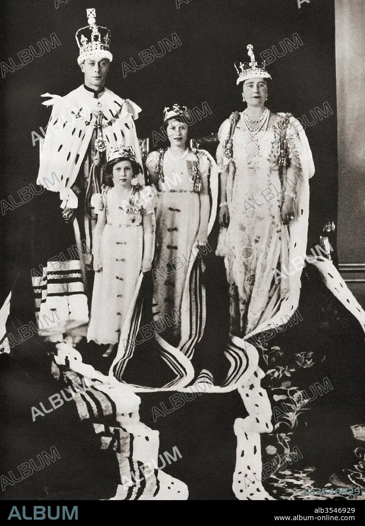 Caption: King George VI and his wife Queen Elizabeth seen here the day of their coronation, 12 May, 1937, with their daughters Princess Margaret and Princess Elizabeth, future Queen Elizabeth II. George VI, 1895 – 1952, King of the United Kingdom. Elizabeth Angela Marguerite Bowes-Lyon, 1900 – 2002. Queen consort of the United Kingdom as the wife of King George VI. Princess Margaret, later Countess of Snowdon, 1930 – 2002. Princess Elizabeth, later Queen Elizabeth II, born 1926. From The Coronation of King George VI and Queen Elizabeth, published 1937.