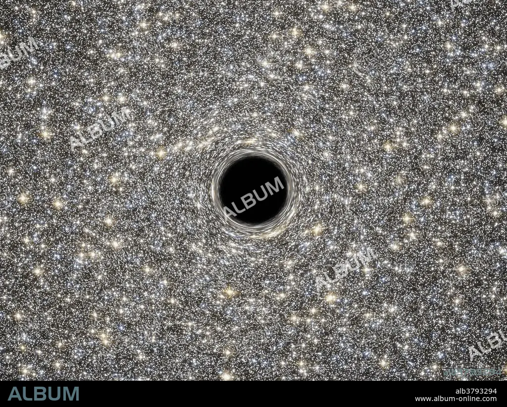 Caption: This is an illustration of the supermassive black hole located in the middle of the very dense galaxy M60-UCD1. It weighs as much as 21 million times the mass of our Sun. Lying about 50 million light-years away, M60-UCD1 is a tiny galaxy with a diameter of 300 light-years, just 1/500th of the diameter of the Milky Way. Despite its size, it contains some 140 million stars. Because no light can escape from the black hole, it appears simply in silhouette against the starry background. The black hole's intense gravitational field warps the light of the background stars to form ring-like images just outside the dark edges of the black hole's event horizon. Combined observations by the NASA/ESA Hubble Space Telescope and NASA's Gemini North telescope determined the presence of the black hole inside M60-UCD1.