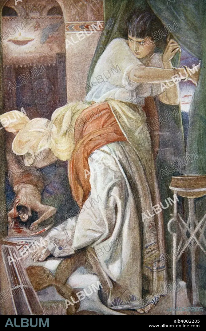 Caption: 'The Murder of Setapo', 1916. Setapo was a wealthy and evil man of Babylon who was murdered by Sinonis. Illustration from Myths and Legends of Babylonia and Assyria by Lewis Spence, 1916.