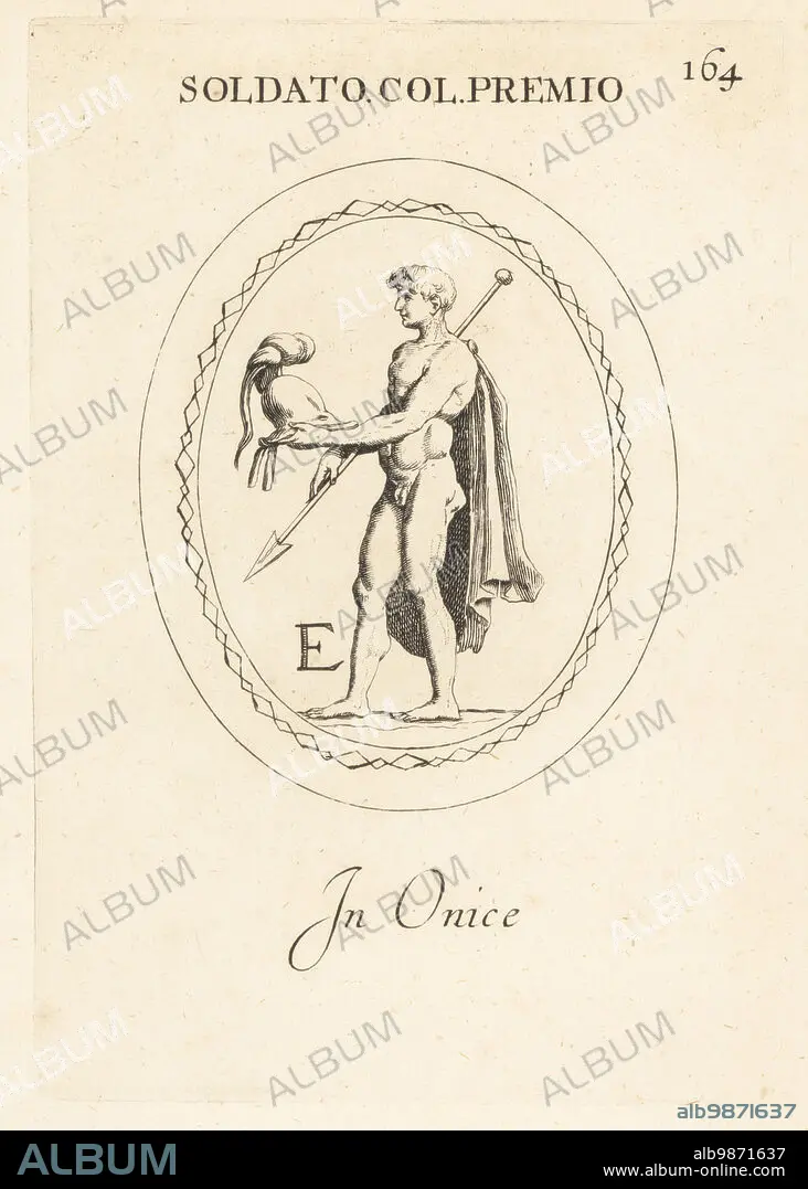 Naked Roman soldier receiving trophies for bravery. In cloak, holding hasta lance and crested helmet. In onyx. Soldato Col Premio. In onice. Copperplate engraving by Giovanni Battista Galestruzzi after Leonardo Agostini from Gemmae et Sculpturae Antiquae Depicti ab Leonardo Augustino Senesi, Abraham Blooteling, Amsterdam, 1685.