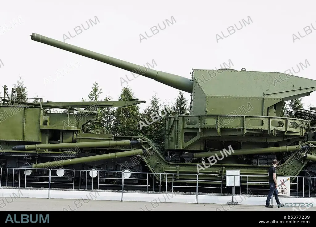 Soviet railway artillery conveyor of Second World War as exhibit of the Moscow Weaponry Museum on Poklonnaya Hill, Moscow, Russia, Europe