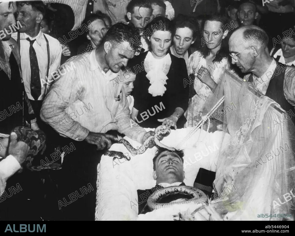 Weird Kites: During the funeral service of Lewis Ford at the Dolly Pond Church of God at Chattanooga, Tennessee, the rattlesnake which had caused his death during a religious ceremony was placed on his head by the Rev. Raymond Hayes. Ford's widow is at the head of casket, pats the snake. September 29, 1945.
