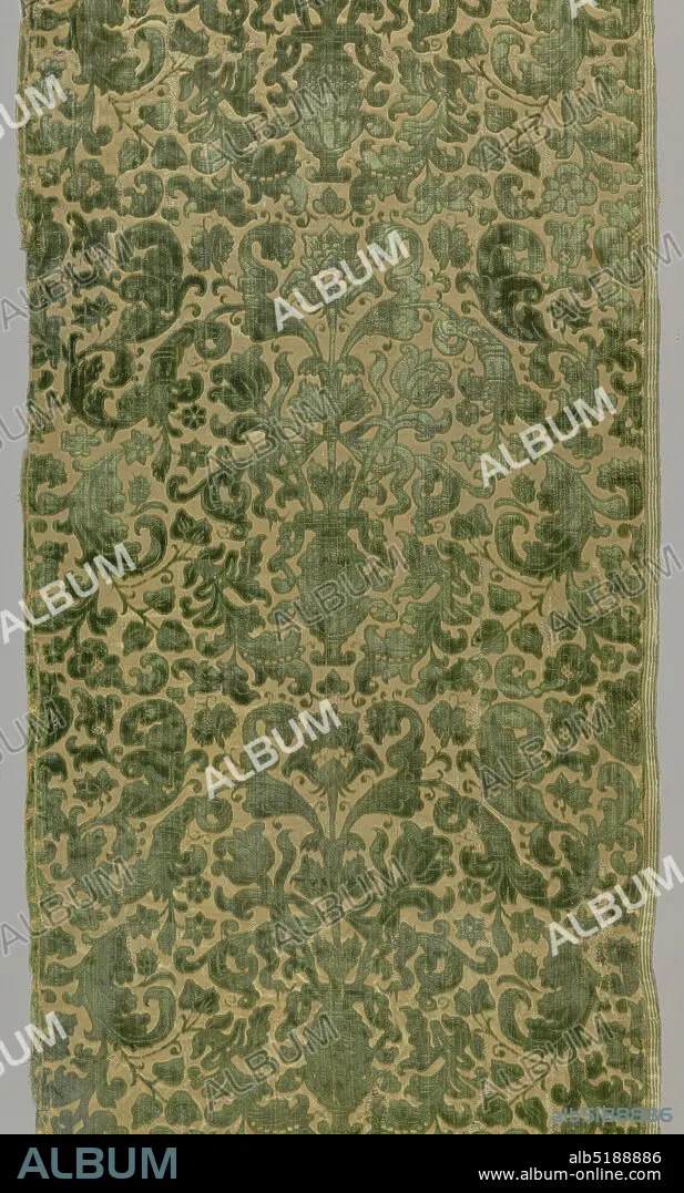 Caption: Textile, Medium: silk Technique: cut and uncut loops of a supplementary warp (green) in a 7 & 1 satin foundation (white), Vase and scroll pattern in green on cream., Italy, 17th century, woven textiles, Textile