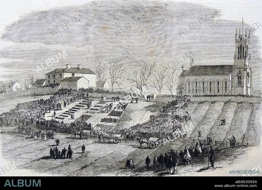 Hartley Colliery Pit Disaster, Northumberland, 16 January 1862. 220 lives were lost. Burying the pitman near Earsdon Church. Engraving, London, 1862.